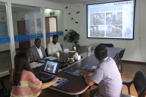 非洲吉布提客戶需要訂制全套牛奶生產線設備,來我公司參觀并與銷售人員進行具體細節(jié)的洽談。
